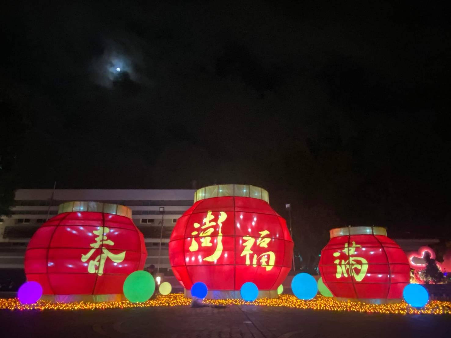 2022年1月,澎湖縣政府在府前廣場布置「春滿澎福」三座大型燈籠,祝福返鄉的遊子以及在地縣民。(澎湖縣政府提供)