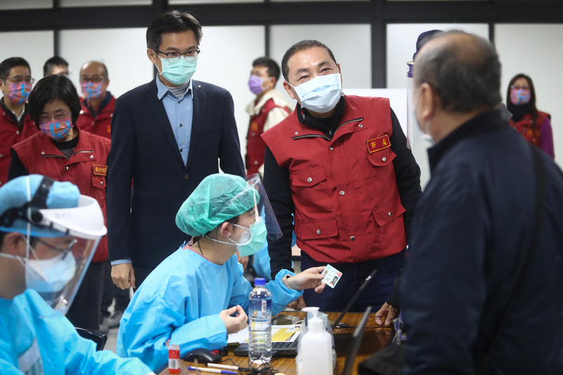 新北市長侯友宜(中右)18日上午在亞東醫院院長邱冠明(中左)陪同下,前往板橋第一運動場視察COVID-19疫苗接種動線,關心長者接種情形。(圖/中央社)