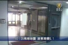 2012-02-26 21:03:43新聞一開始,首先帶您來關注地震的消息,今天(26號)上午屏東發生規模6.1有感地震,南台灣感受強烈,高雄捷運在第一時間,就疏散旅客停止營運,高鐵列車也在行駛到嘉義時,因為地震而緊急停駛;至於在台南,也有民宅水塔被震破漏水,還有監視器,捕捉下地牛翻身,民眾驚慌逃逸的一瞬間!