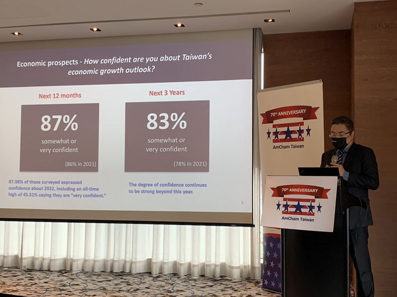 台灣美國商會今天舉辦「2022商業景氣調查」記者會,新任會長施立成指出,「會員回應非常正面,對台灣經濟前景看法比去年更好」。調查結果顯示,高達87%會員對台灣今年經濟表現表達信心,創歷年最高;83%企業則對於台灣未來3年經濟前景抱持樂觀態度。