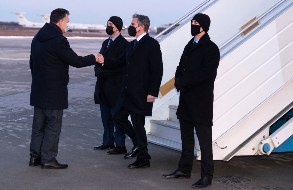 美國國務卿布林肯(Antony Blinken)(圖中)於2022年1月19日抵達基輔鮑里斯波爾(Boryspil)國際機場時受到烏克蘭副外長德米特羅·塞尼克(Dmytro Senik)(圖左)的歡迎。(圖/GettyImages)