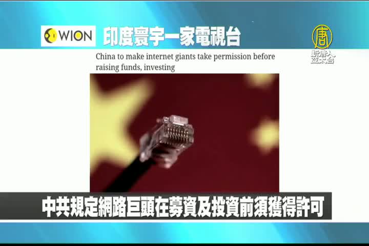 【新唐人亞太台 2022 年 01 月 20 日訊】最後是印度寰宇一家電視台報導:中共規定網路巨頭在募資及投資前必須獲得許可,顯示中共對於網路的監管更加嚴格。