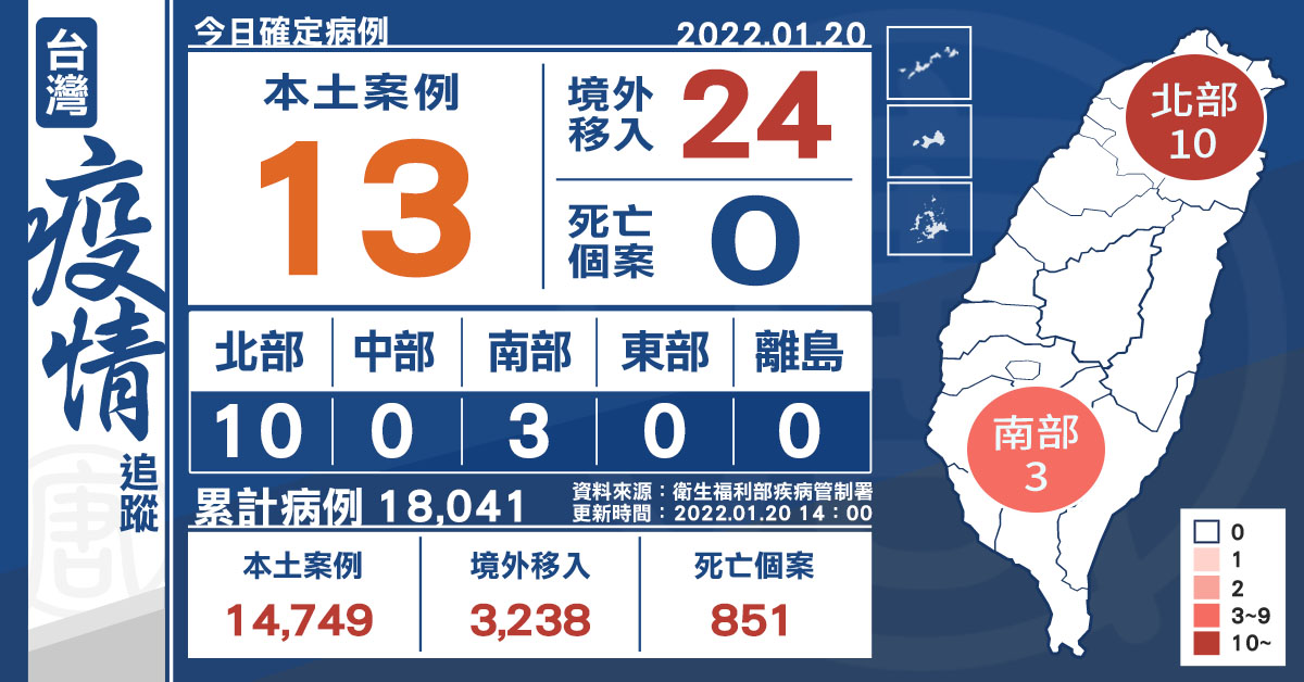 指揮中心統計,截至目前國內累計5,363,205例中共病毒肺炎相關通報(含5,344,301例排除),其中18,041例確診,分別為3,238例境外移入,14,749例本土病例,36例敦睦艦隊、3例航空器感染、1例不明及14例調查中;新增1例空號病例(案18119,再次採檢為陰性,改判排除),累計116例移除為空號。2020年起累計851例COVID-19死亡病例,其中838例本土,個案居住縣市分布為新北市413例、臺北市322例、基隆市29例、桃園市27例、彰化縣15例、新竹縣13例、臺中市5例、苗栗縣3例、宜蘭縣及花蓮縣各2例,新竹市、南投縣、雲林縣、臺南市、高雄市、屏東縣及臺東縣各1例;另13例為境外移入。