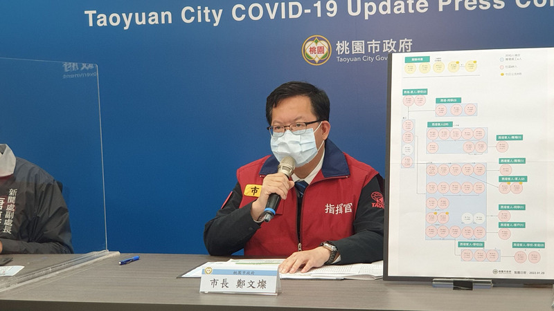 桃園市長鄭文燦20日主持疫情說明記者會時表示,2例不明感染源個案是一對八德區母女,已完成職場採檢、匡列中。 (圖/桃園市政府提供)