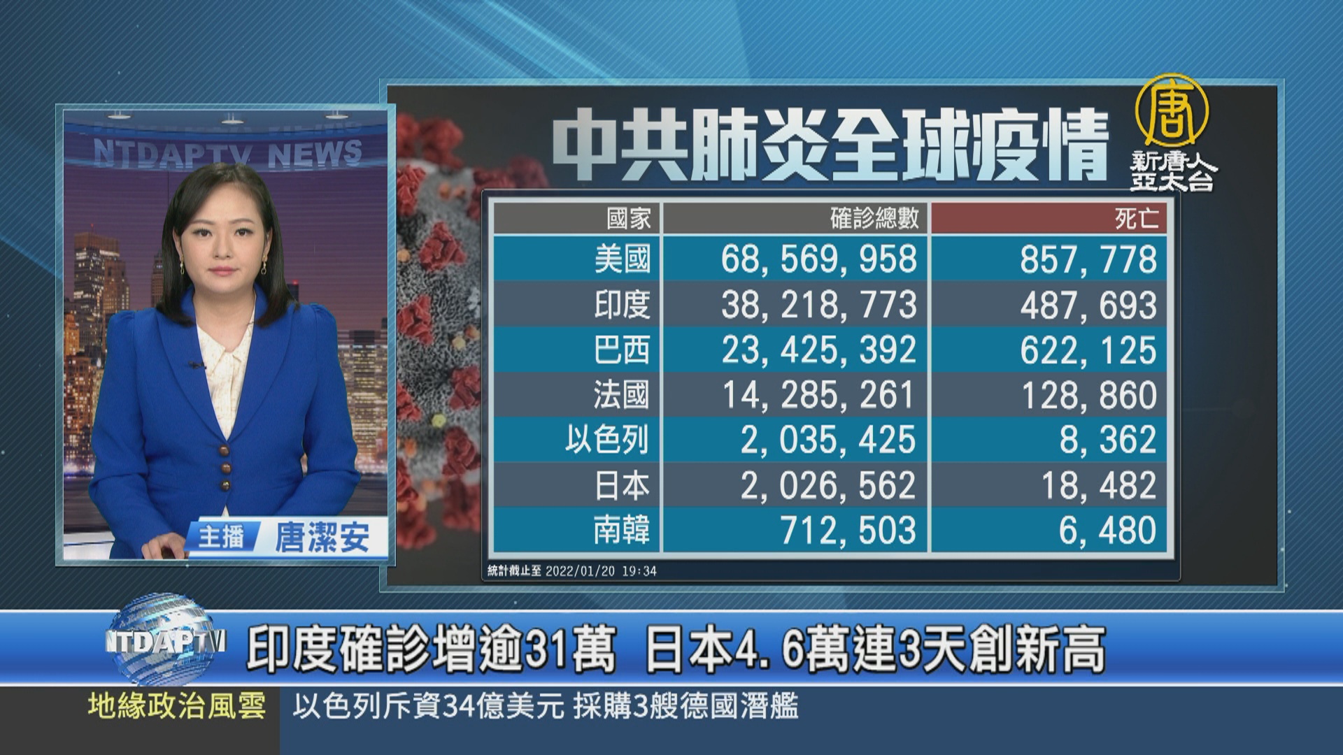 【新唐人亞太台 2022 年 01 月 20 日訊】來關心中共肺炎疫情最新情況,全球確診超過3億3千7百97萬例,死亡5百56萬5千多人。但中共、伊朗等政權,被認為嚴重低報數據。亞洲方面,印度新增31萬7千多例確診,連續第8天單日增加超過20萬例。日本確診新增4萬6千多例,連續第3天創下歷史新高,累計確診突破2百萬例,其中,東京新增8千6百多例,也連續第二天創新高紀錄。南韓新增6千6百多起確診,是最近27天以來單日最高紀錄。歐洲部分,法國新增43萬6千例確診,連續第2天通報超過40萬例。Omicron變異株持續肆虐,瑞典、丹麥和挪威都創下單日新高。南美洲的巴西新增確診20萬4千例,也是連續第2天刷新單日紀錄。以色列新增確診7萬2千例,創下爆發疫情以來的新高。