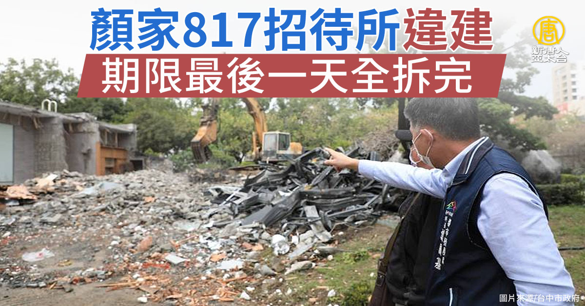 【新唐人亞太台 2022 年 01 月 21 日訊】再來看到,前立委顏寬恒家族,在中二立委補選期間,被爆出南屯817公保地招待所違建,自行開拆39天只拆了50%,台中市府上週五下通牒7天內拆完,在今天(21日)到期的最後一天,終於全部拆除完畢。至於沙鹿豪宅莊園也複查確定違建超過百坪、沙鹿山頂腳黃昏市場違建將近300坪,也限期違建人14天內改善,等於是三大違建都得拆。