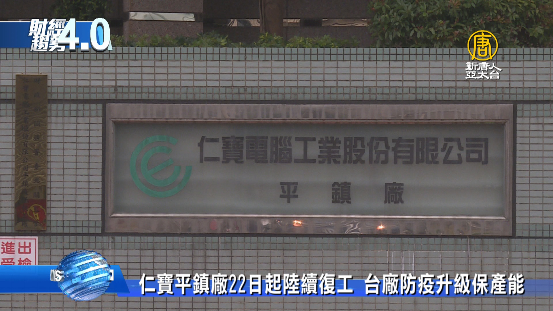 【新唐人亞太台 2022 年 01 月 22 日訊】台灣本土疫情燒進科技業,其中,筆電代工廠仁寶平鎮廠,有三名員工確診,配合防疫停工一周後,預計在22日陸續復工,目前多家企業已經重啟分流上班,禁止賓客來訪等等,避免疫情影響產能。