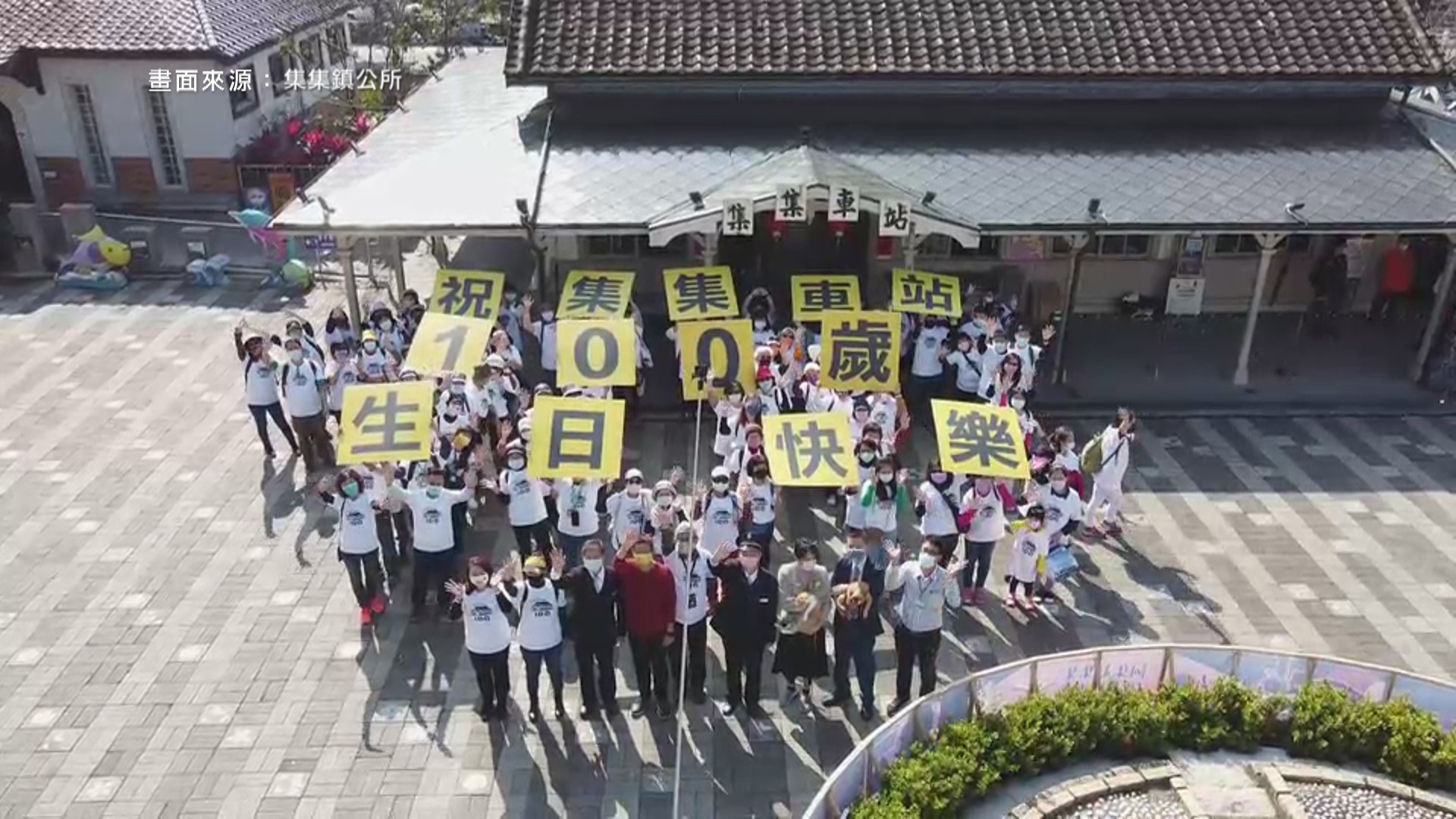 集集車站歡慶一百歲生日,來自全台100位鐵道迷和各界嘉賓齊唱生日快樂歌,還排出100字型,高舉生日快樂字卡,留下歷史上的畫面。