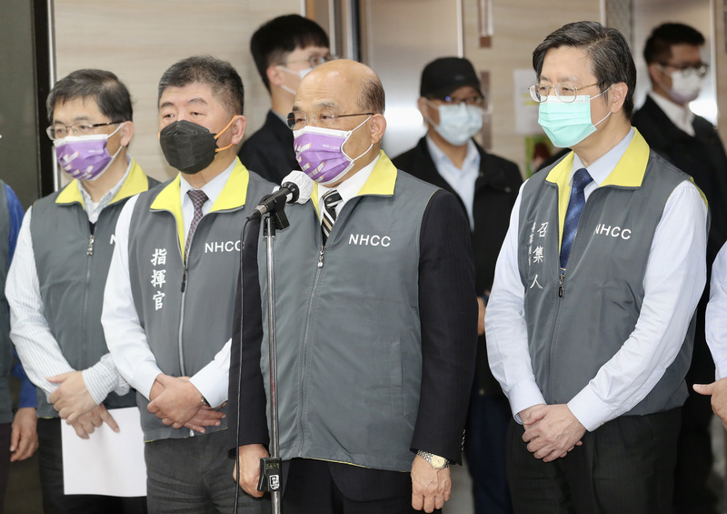 本土疫情升溫,行政院長蘇貞昌(前右2)23日視察中央流行疫情指揮中心時表示,Omicron傳播非常快速,但都是輕症、甚至無症狀,台灣也是這樣,呼籲民眾「戒慎不必恐懼」。(圖/中央社)