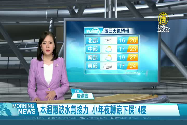 【新唐人亞太台 2022 年 01 月 24 日訊】歡迎您收看1月24日的早安新唐人,我是唐潔安,先來帶您關心天氣。這個週末就要迎接過年假期了,氣象局說,本周有兩波水氣接力,從週一到週三(24至26日) 第一波水氣報到,星期五(28日)鋒面接近,星期六(29日)另一波東北季風再增強,30號小年夜冷空氣又來,北部低溫可能下探14度,除夕至大年初二東北季風影響,北部及東北部天氣較涼。帶您一起來看到國際媒體重要訊息。