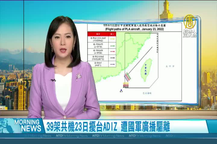 【新唐人亞太台 2022 年 01 月 24 日訊】共機持續侵擾台灣,美日兩國23日在沖繩南方海域進行聯合軍事演習,中華民國空軍昨晚(23日)發布共機動態,指出39架共機侵擾台灣西南防空識別區ADIZ,空軍派遣空中巡邏兵力應對、廣播驅離、防空飛彈追蹤監控。