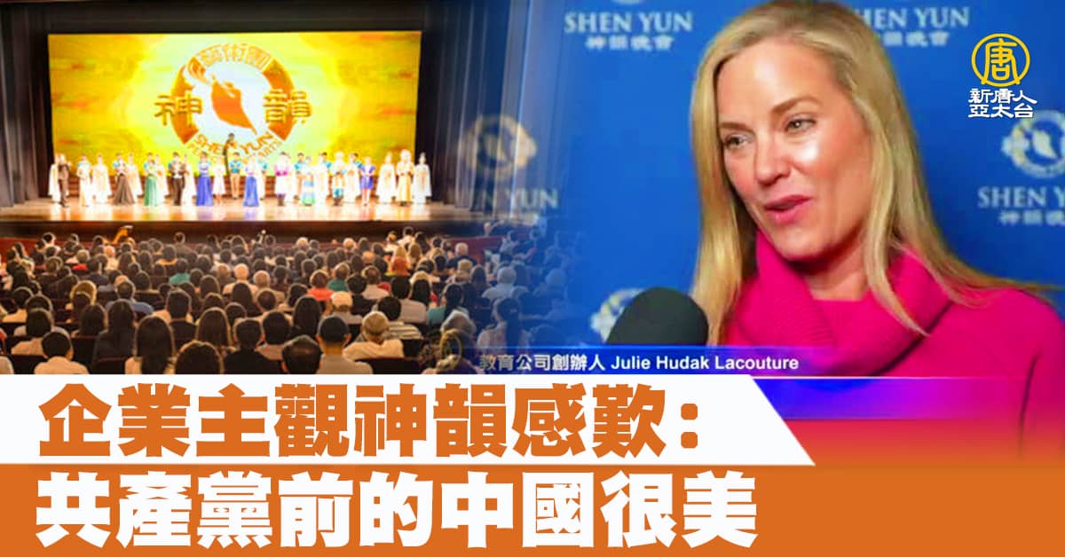 教育公司創辦人 Julie Hudak Lacouture:「我很感激神韻演員們能夠自由的舞蹈,表達自己,致敬自己的信仰。中國現在有很多不幸的事情發生,演出與人們分享了希望、美好、堅毅,展現這些特質給華裔美國人,讓他們可以知道自己的歷史;對於其他美國人來說,他們可以學習、尊重和支持那些不屬於共產政權的中國人。」