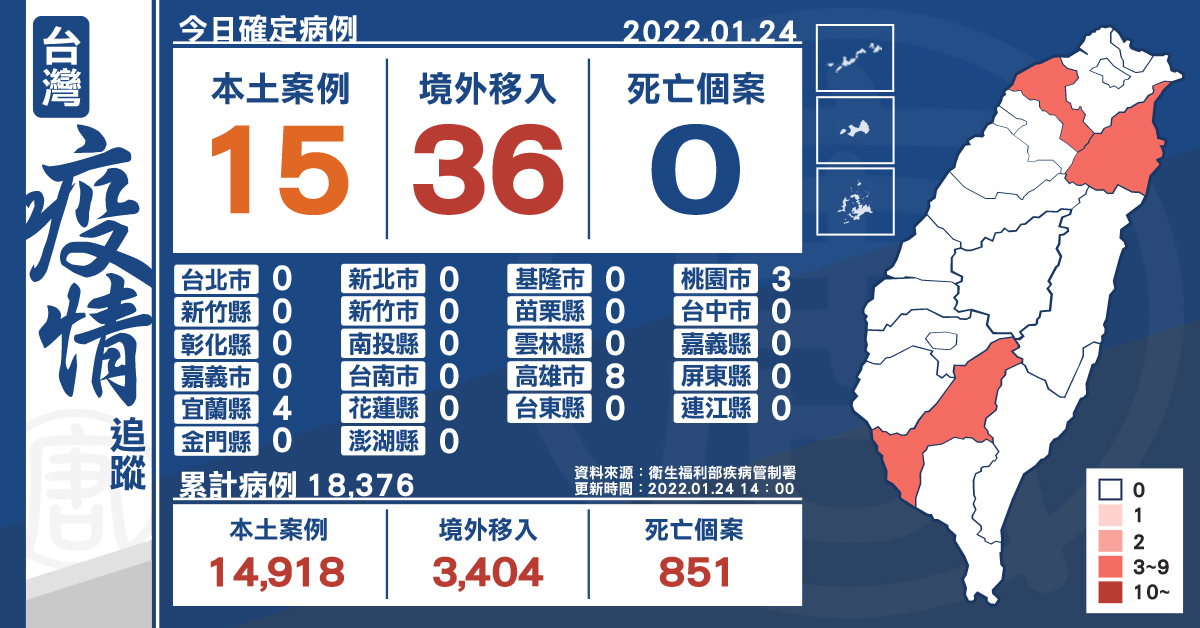 【新唐人亞太台 2022 年 01 月 24 日訊】今(24)日中央流行疫情指揮中心公布,國內新增51例COVID-19確定病例,分別為15例本土個案及36例境外移入;另確診個案中無新增死亡。