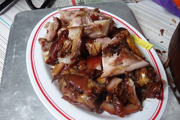 餐桌上切好的豬腳,肉質軟Q好吃,用筷子夾起來,皮和肉連著蹄筋慵懶地擺動。(大紀元)
