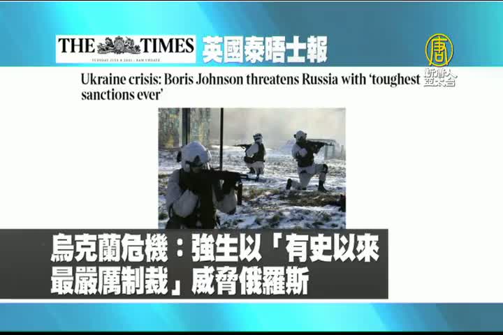 【新唐人亞太台 2022 年 01 月 26 日訊】接著是英國泰晤士報的報導:烏克蘭危機,英國首相強生以「有史以來最嚴厲的制裁」威脅俄羅斯。