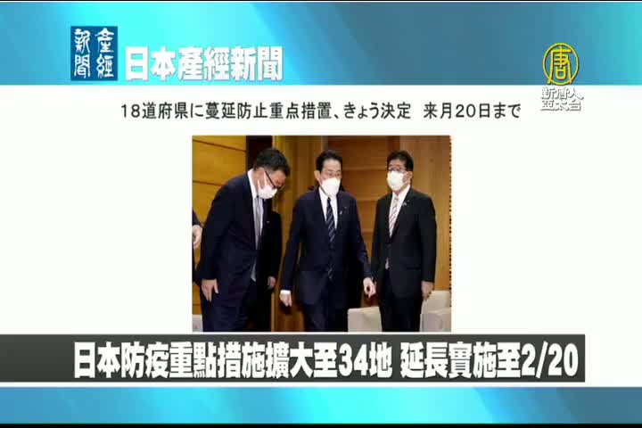 【新唐人亞太台 2022 年 01 月 26 日訊】來看到日本產經新聞報導:日本防疫重點措施擴大至34個地區,並延長實施至2月20號。