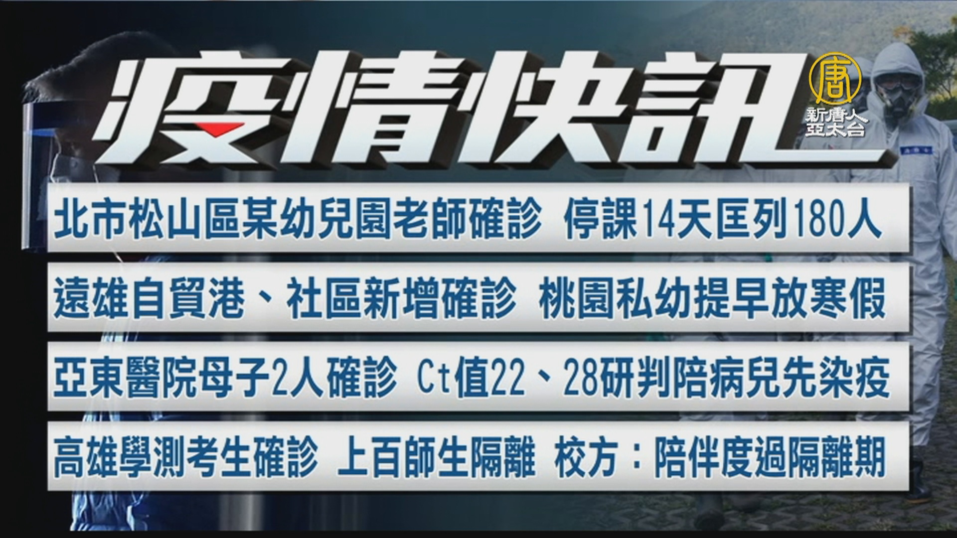 【新唐人亞太台 2022 年 01 月 26 日訊】新聞開始先來關心,這週末就要迎接長達九天的過年連續假期了,帶您掌握今早的疫情動態,台北市松山區某幼兒園老師確診,停課14天匡列180人。在桃園的部分,遠雄自貿港與社區都有新增確診 ,桃園私幼提早放寒假。另外,新北亞東醫院母子2人確診,Ct值22、28,研判是陪病兒先染疫。另外,高雄有學測考生確診,上百師生送防疫旅館隔離,校方說:會安排線上陪伴,度過隔離期。
