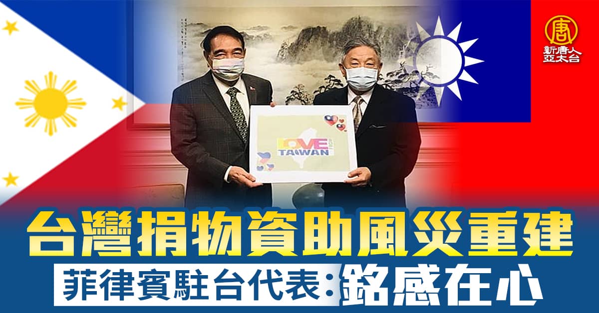 【新唐人亞太台 2022 年 01 月 26 日訊】菲律賓去年底遭超級颱風雷伊嚴重侵襲,為協助菲國政府加速重建,政府籌措近100公噸賑濟物資,今天舉行捐贈典禮。菲律賓駐台代表費南德代表受贈,並表示菲國政府及人民銘感在心。