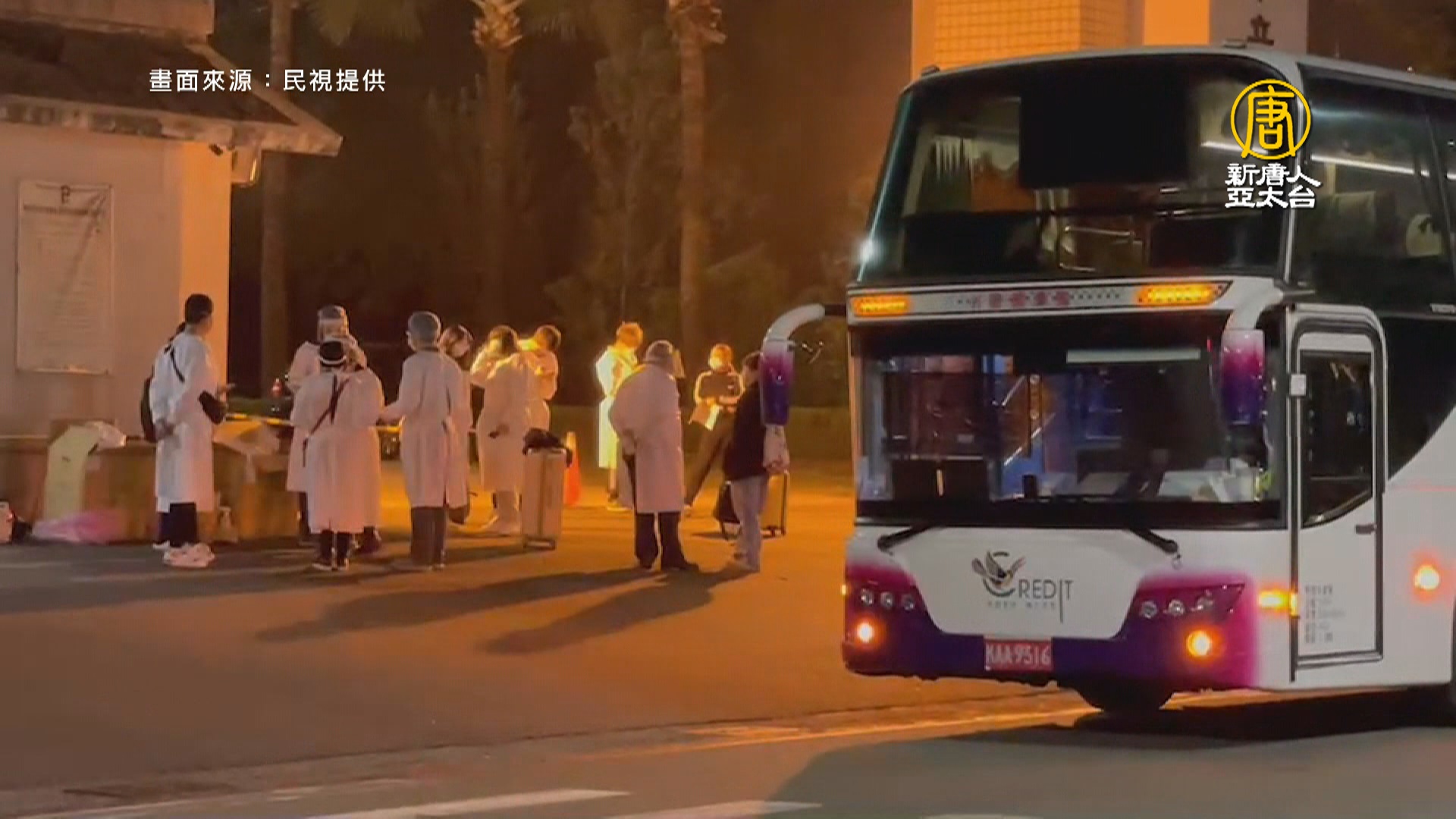 大批師生,穿上防護衣,被緊急帶上遊覽車,高雄某高中學生,爆出確診,衛生局緊急進駐校園,學校師生送往集中檢疫所隔離。
