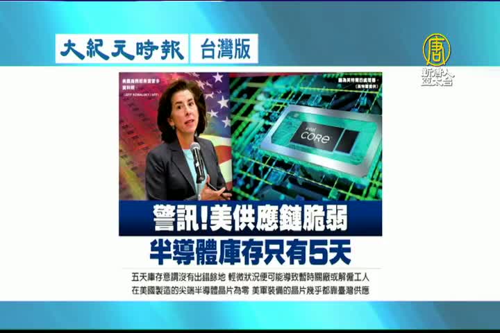 【新唐人亞太台 2022 年 01 月 27 日訊】接著看到大紀元時報台灣版報導:美國商務部長雷蒙多25日表示,半導體晶片供應緊張,美國企業的關鍵晶片庫存量從2019年的40天,降到只剩5天。
