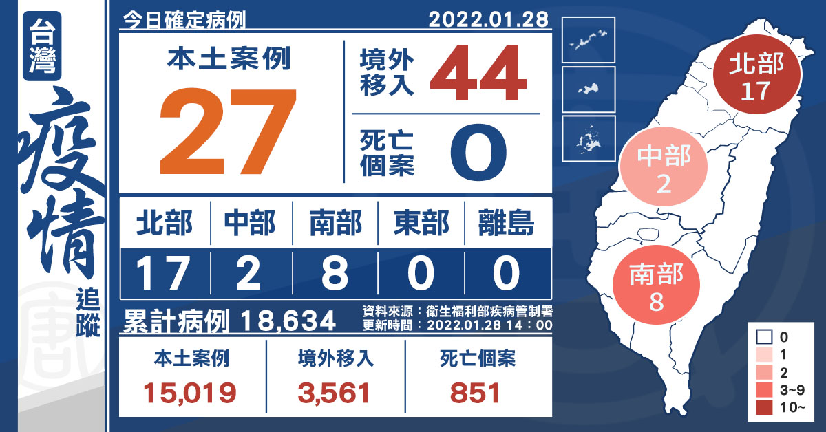【新唐人亞太台 2022 年 01 月 28 日訊】今(1/28)中央流行疫情指揮中心宣布,今增27例本土個案及44例境外移入;另確診個案中無新增死亡。本土個案中,高雄港區有4例居隔陰轉陽,北市房仲相關再增6例,宜蘭礁溪長榮鳳凰酒店今加4位,亞旭2位員工,由陰轉陽,錢都涮涮鍋相關3例、西堤餐廳傳幼兒園染疫1例,龍潭退休人員案今有3位確診,桃園市確診幼兒園女老師案18613回台中確診,其中有9例居隔陰轉陽。