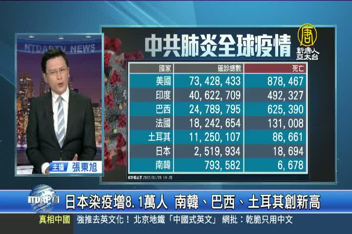 【新唐人亞太台 2022 年 01 月 28 日訊】再來關心,中共肺炎動態,目前全球公開數據,累計確診3億6千6百58萬人,累計死亡563萬人。其中,中共、伊朗等國家,被認為嚴重低報數據。美國累計確診7千3百42萬人,死亡87.8萬人;南美洲巴西新增確診22萬8千9百多例,連續2天創下單日新高,死亡新增672人。歐洲的法國新增確診39.2萬人,累計確診1千8百24萬人;土耳其新增確診8.2萬人,創下單日新高。亞洲的印度累計確診4千零62萬人;日本新增確診8.1萬人,其中東京新增1.7萬例,連續4天創下新高,大阪則首次超過1萬人確診,另外埼玉、神奈川、愛知等多個縣市都創下新高。南韓新增確診1.6萬人,連續四天刷新紀錄。