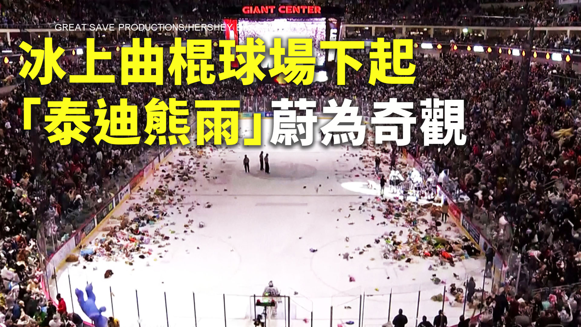 【新唐人亞太台 2022 年 01 月 29 日訊】美國賓州一支職業冰上曲棍球隊 「好時熊」隊(Hershey Bears),最近舉辦一年一度的「拋泰迪熊」(Teddy Bear Toss)慈善行動。當比賽進行到第一次射門得分,場邊的觀眾就可以一起把準備好的絨毛娃娃扔進場內。
