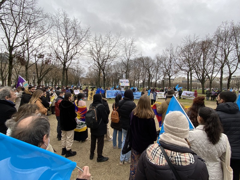20個民團、上百名法國、維吾爾、西藏、香港、越南、台灣等民眾昨天集結法國外交部旁廣場,表示中共壓迫各地人民,違反民主與奧運精神,強力要求法國政府不派出代表出席2月4日登場的北京冬奧。(圖/中央社)
