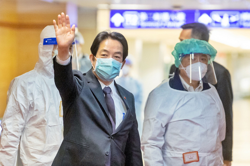副總統賴清德(前左)結束6天5夜訪團行程,所搭乘的中華航空公司班機30日晚間8時44分降落在桃園國際機場,不過基於防疫因素,賴副總統並未發表相關談話,僅向國賓門外守候的採訪記者揮手致意。(圖/中央社)