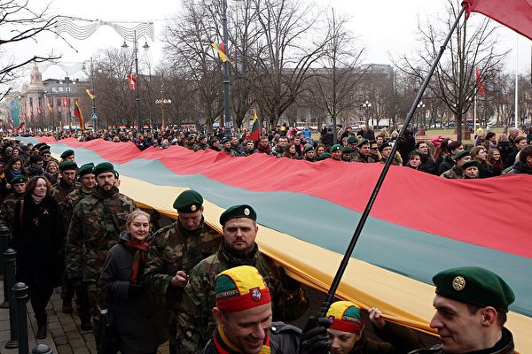圖為2015年3月11日,立陶宛人在慶祝脫離蘇聯獨立25周年的遊行中舉著國旗行走。(PETRAS MALUKAS/AFP via Getty Images)