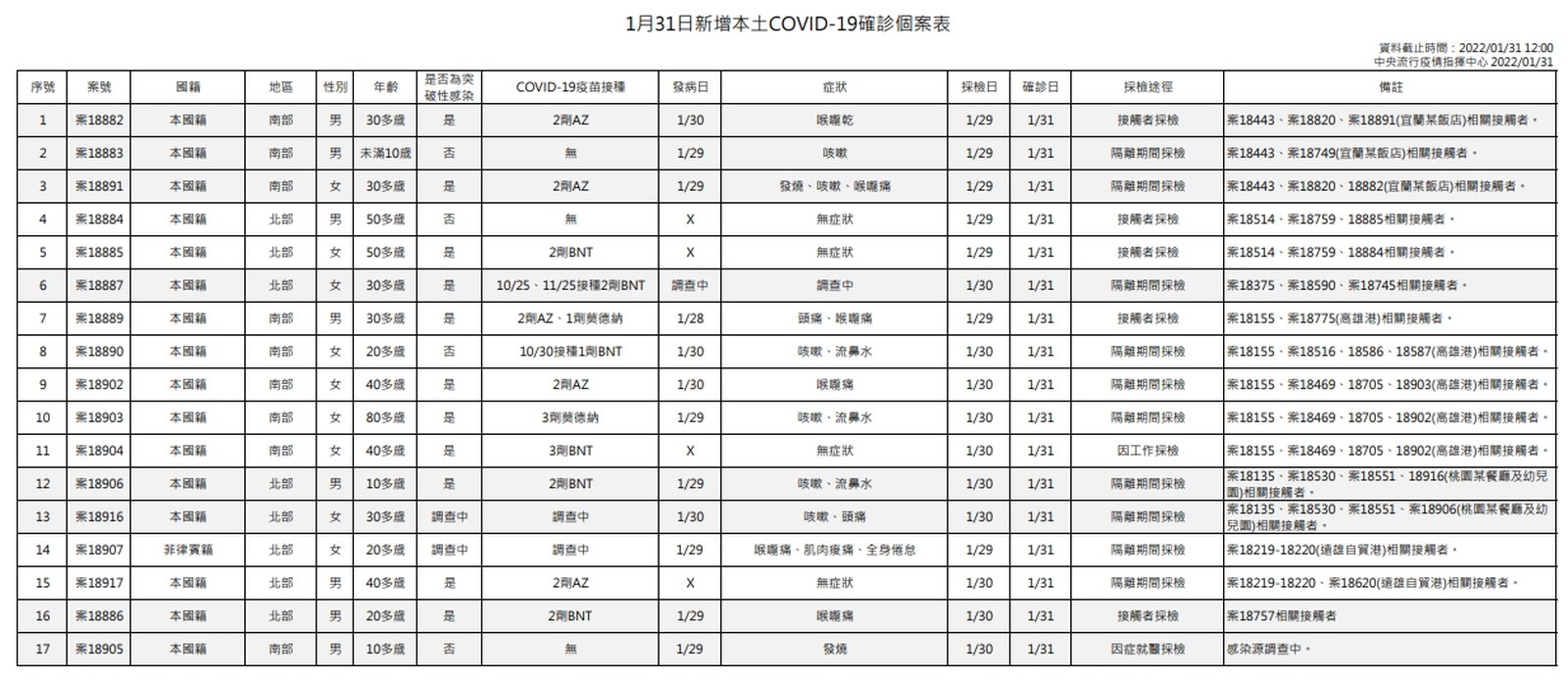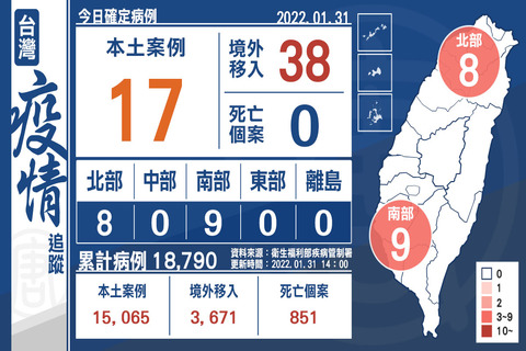 【新唐人亞太台 2022 年 01 月 31 日訊】今(31)日中央流行疫情指揮中心公布,國內新增17例本土個案及38例境外移入(20例為航班落地採檢陽性);另確診個案中無新增死亡。