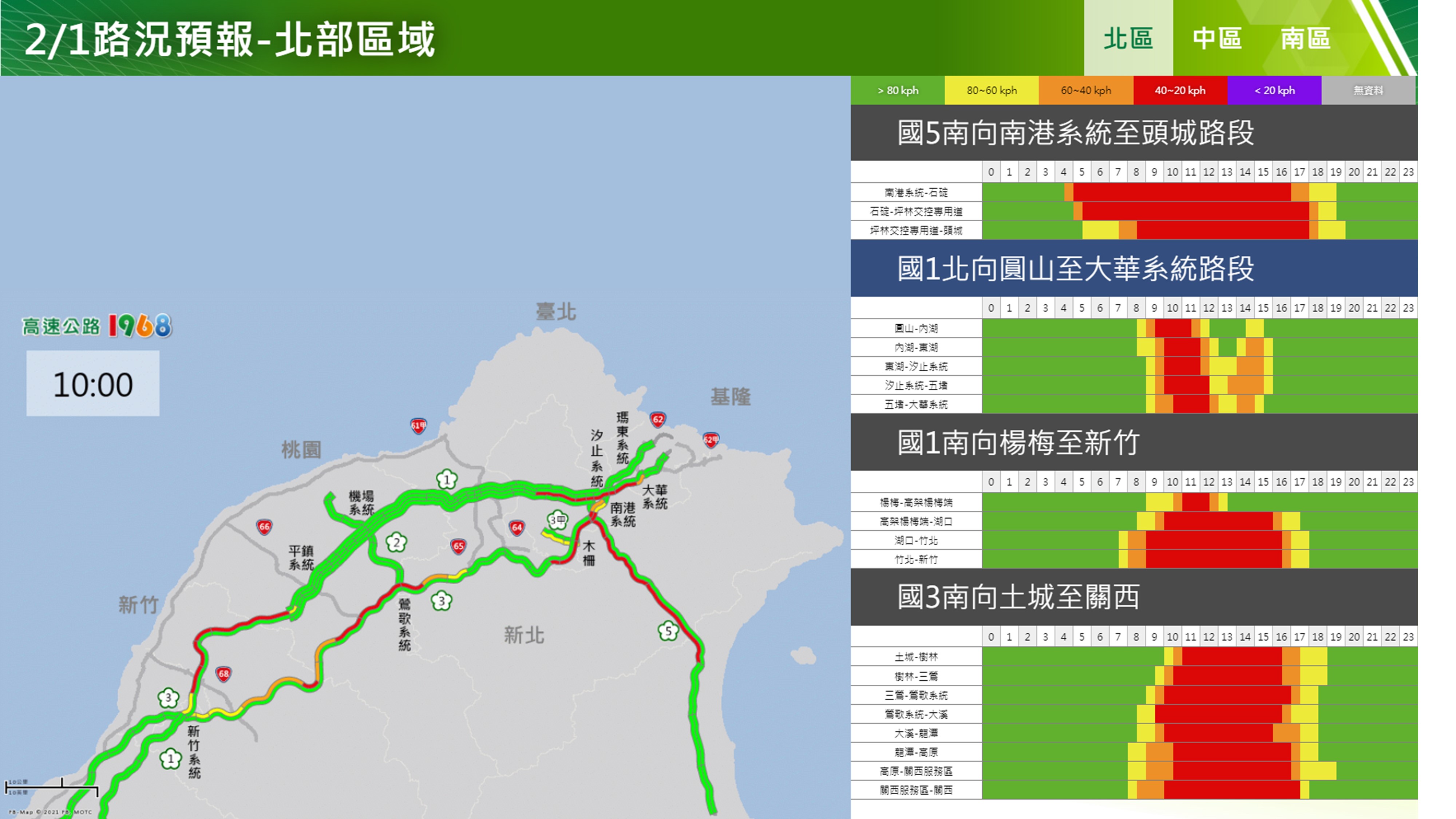 高公局預判明天重點壅塞路段,將出現在國1南向楊梅-新竹、彰化系統-埔鹽系統,北向圓山-大華系統;國3南向土城-關西、快官-霧峰,北向草屯-霧峰;國5南向南港系統-頭城,北向宜蘭-坪林等路段。建議南向用路人儘量於下午時段出發、北向用路人儘量於上午時段出發,節省寶貴時間。