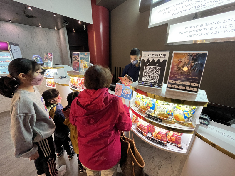 本土疫情升溫,台北市政府宣布,電影院1日起加強管制,餐飲部可販售飲食,但影廳內須全程配戴口罩,禁止飲食。民眾大年初一前往電影院度過假期。(圖/中央社)