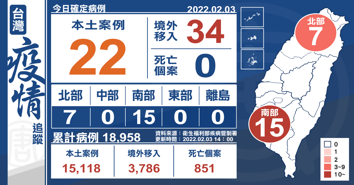 【新唐人亞太台 2022 年 02 月 03 日訊】中央流行疫情指揮中心今(3)日公布國內新增56例COVID-19確定病例,分別為22例本土個案及34例境外移入(10例為航班落地採檢陽性);另確診個案中無新增死亡。
