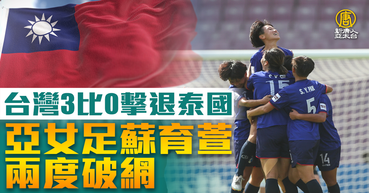 【新唐人亞太台 2022 年 02 月 04 日訊】21歲的年輕女將蘇育萱今天把泰國隊的禁區當後花園逛,她在上、下半場兩度破網,再加上陳英惠在傷停時間的自由球進球,台灣今天在亞洲盃女子足球賽附加賽以3比0擊敗泰國隊。