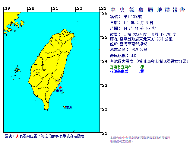 【新唐人亞太台 2022 年 02 月 06 日訊】今天(6日)下午2點54分,台灣東南部海域發生芮氏規模4.0地震,震央出現在台東縣政府東北東方26.8公里處 ,深度29.9公里,各地最大震度台東市3級、花蓮縣富里2級。