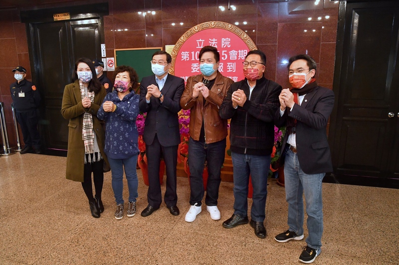 立法院第10屆第5會期7日開始立委報到,國民黨立委洪孟楷(右起)拔得頭籌、第2位報到的是民進黨立委陳歐珀、第三位是台灣民眾黨立法院黨團總召、立委邱臣遠;3人與國民黨立委曾銘宗、葉毓蘭及民眾黨立委高虹安合影。(圖/中央社)