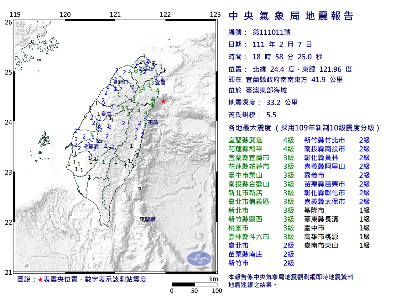 【新唐人亞太台 2022 年 02 月 07 日訊】依據中央氣象局指出,今天(7)日晚間18:58左右,宜蘭縣發生芮氏規模5.5有感地震,震央相對位置為宜蘭縣府東南方41.9公里處,位在台灣東部海域,地震深度33.2公里,各地震度最大4級、最小1級,全台有感。