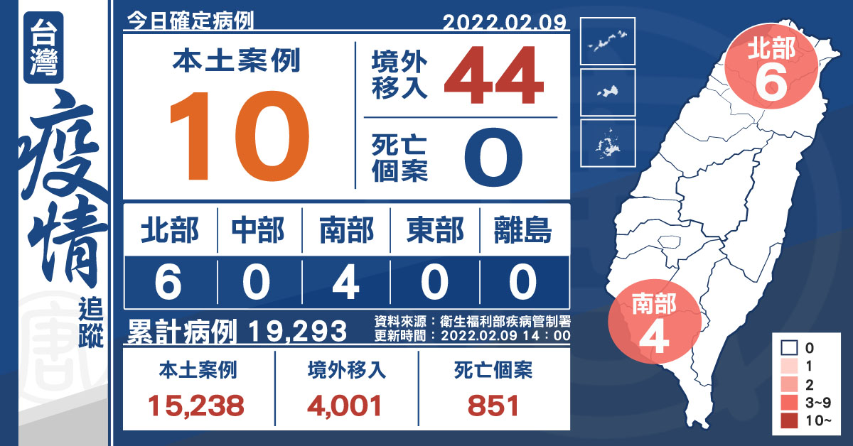 【新唐人亞太台 2022 年 02 月 09 日訊】中央流行疫情指揮中心今(9)日公布國內新增54例COVID-19確定病例,分別為10例本土個案(5例為居隔陰轉陽)及44例境外移入(25例為航班落地採檢陽性);另確診個案中無新增死亡。