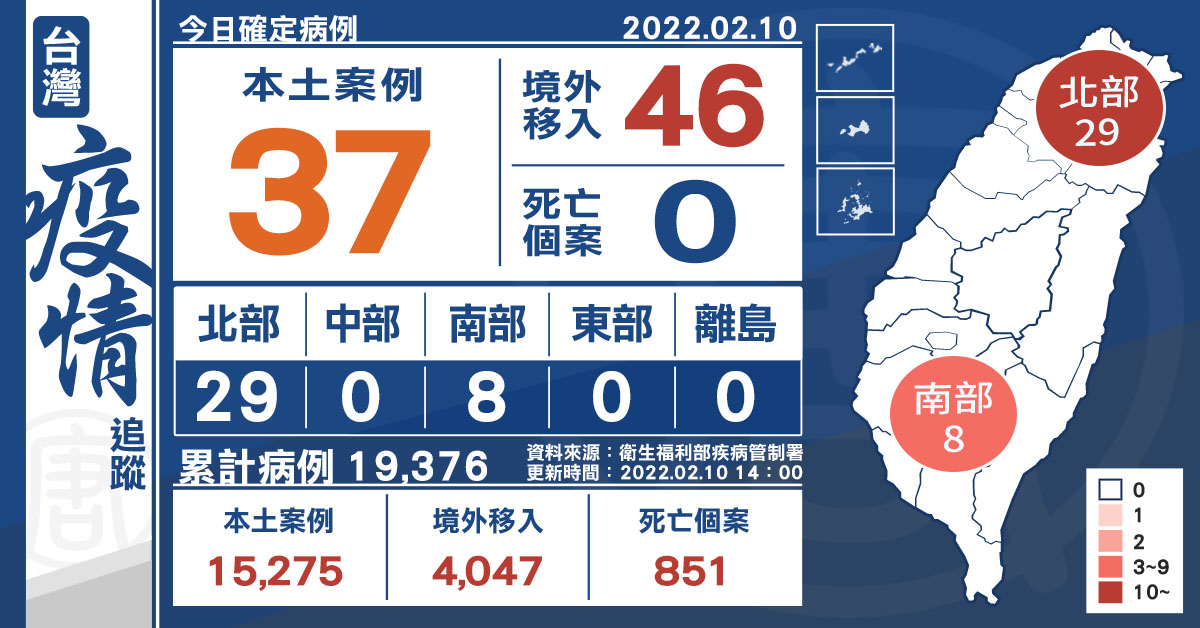 【新唐人亞太台 2022 年 02 月 10 日訊】今(10)日中央流行疫情指揮中心公布,國內新增83例COVID-19確定病例,分別為37例本土個案及46例境外移入,15例為航班落地採檢陽性;另確診個案中無新增死亡。