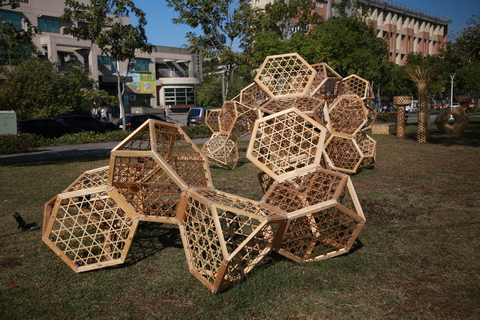 呂秉承還說,超過兩百公分以上高度的竹編基座,由三十幾位師生協力完成,更細心考量編織隙縫間隔在三到四公分以內,避免小朋友手伸進去,另外竹編輪口的孔洞也大多安排在一百公分到一百二十公分高度以上,較低輪口開口也盡量縮小直徑尺寸,避免小朋友頭探進去的危險。