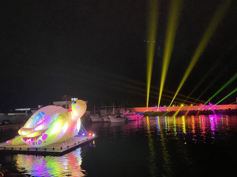澎湖「2022外垵元宵」系列活動15日晚間登場,3層樓高的「福龜」主燈,12日晚間在港區完成充氣,並順利試點燈光。(圖/澎湖縣政府提供)