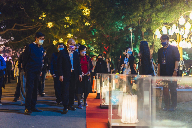 行政院長蘇貞昌(前左2)13日晚間在高雄市長陳其邁(前左)陪同下視察「2022台灣燈會在高雄」,走訪衛武營、愛河灣雙主場,欣賞多項燈光表演作品。(圖/高雄市政府提供)