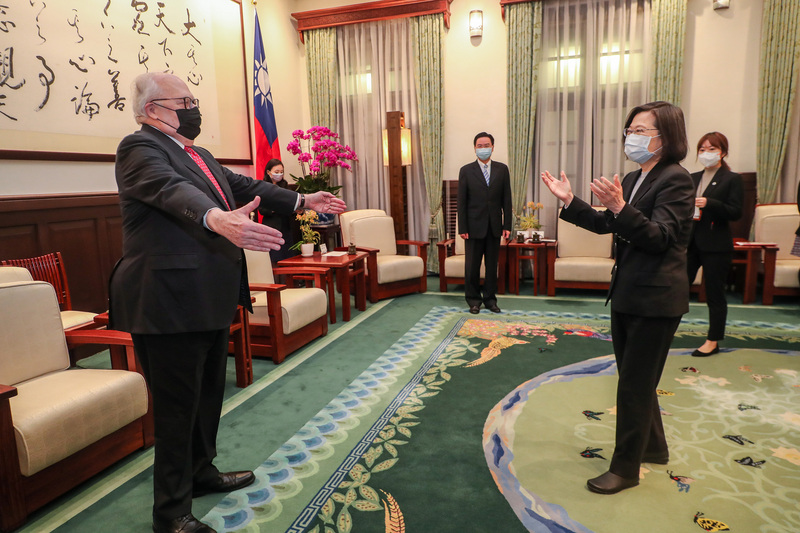 總統蔡英文(前右)15日在總統府接見美國華府智庫 「傳統基金會」創辦人佛訥(Edwin J. Feulner Jr.) (左),受疫情影響,蔡總統與佛訥分別張開雙臂, 象徵在空中擁抱老朋友、熱情致意。(圖/中央社)