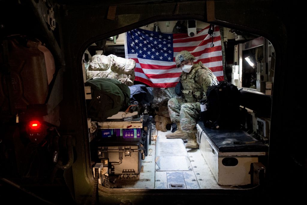 美國計劃派2000人到斯洛伐克參加北約的「軍刀打擊」軍演,一名路透社目擊者表示,首批美軍及數以百計的車輛從德國出發後,已經進到捷克。 圖為2022年2月15日,美國陸軍車隊在越過德國捷克邊境羅茲瓦多夫市時,在美國軍車上的美國士兵。(圖/GettyImages)