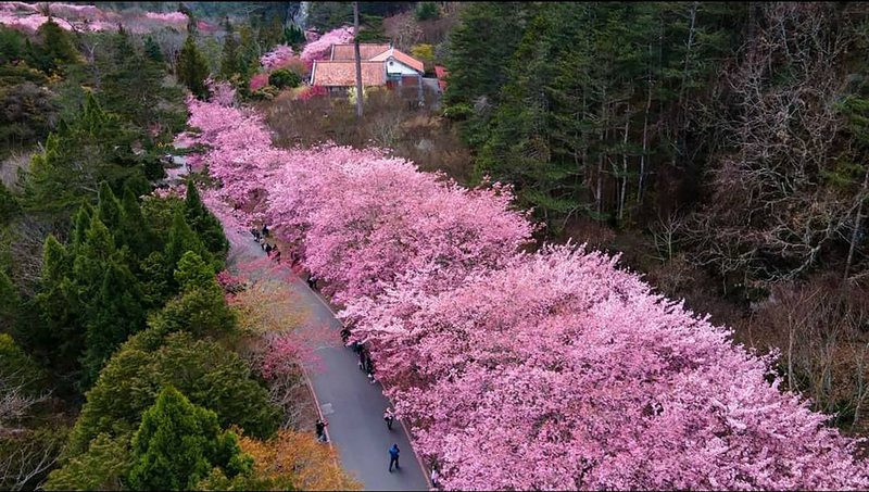 全台瘋賞櫻,福壽山農場位處海拔高度2100至2614公尺間,有「遠的要命農場」之稱,園內千櫻園面積達13公頃,種植6000多株的櫻花,緋寒櫻、富士櫻、昭和櫻、吉野櫻及大島櫻等5種櫻花,粉紅色系櫻花現正大爆發時期,自2月中持續盛開到二二八連假結束。