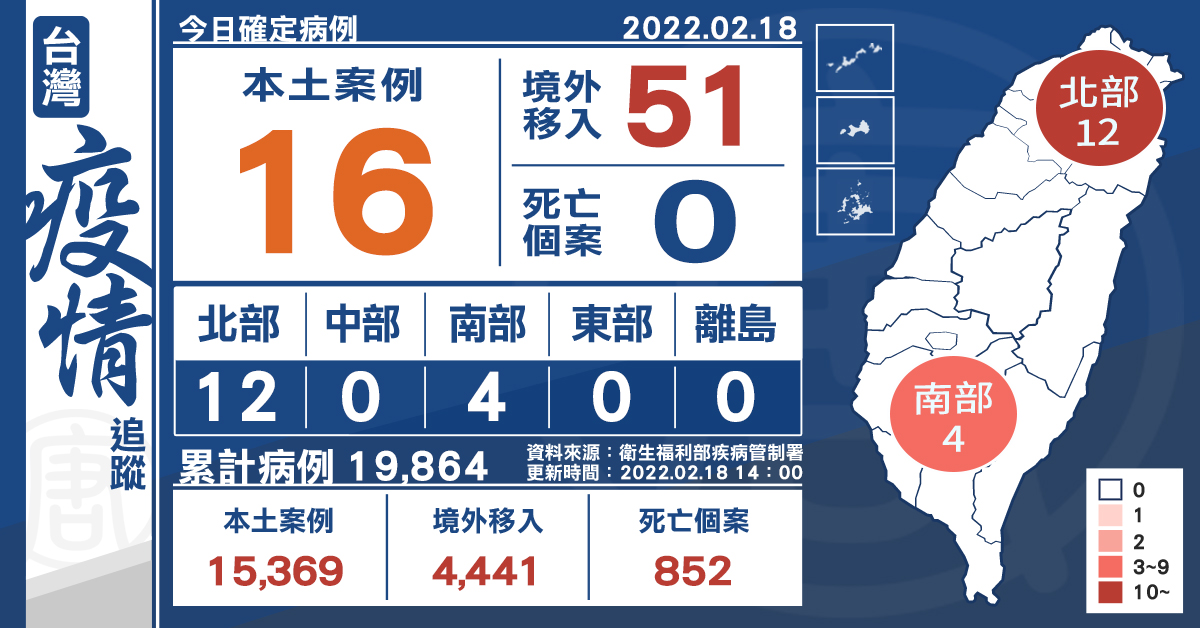 2022-02-03 00:29:44今(2)日中央流行疫情指揮中心公布,國內新增16例本土個案及37例境外移入,25例為航班落地採檢陽性;另確診個案中無新增死亡。