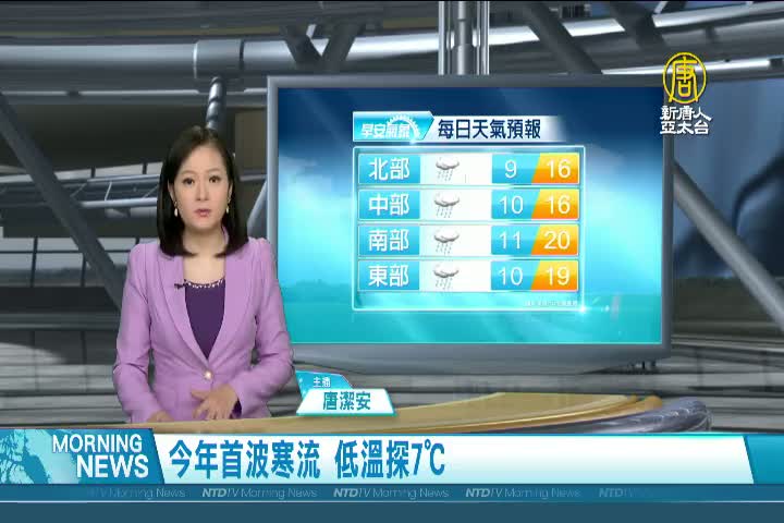 【新唐人亞太台 2022 年 02 月 21 日訊】歡迎您收看2月21日的早安新唐人,我是唐潔安,先來帶您關心天氣。今年首波寒流來襲,全台急凍,截至昨晚七點,已有22個氣象測站創下去年入冬以來新低溫,台南以北至宜蘭昨晚低溫下探七至八度,全台灣除了屏東、台東外,今天上午前都是低溫特報範圍,帶您一起來看到國際媒體重要訊息。