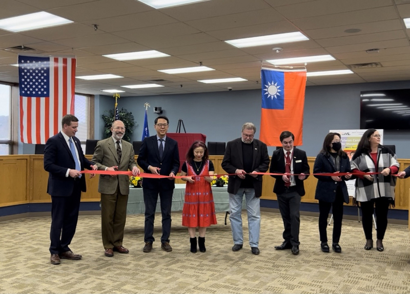 美國威斯康辛州北美中文學校設置的台灣華語文學習中心18日在西本德市政大廳揭牌,駐芝加哥辦事處長姜森(左3)等人剪綵。(圖/駐芝加哥辦事處提供)