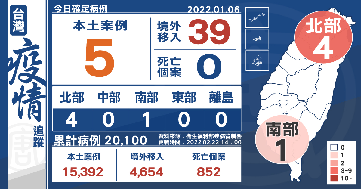 指揮中心統計,截至目前國內累計6,192,221例中共病毒肺炎相關通報(含6,146,253例排除),其中20,100例確診,分別為4,654例境外移入,15,392例本土病例,36例敦睦艦隊、3例航空器感染、1例不明及14例調查中;無新增空號病例,累計134例移除為空號。2020年起累計852例COVID-19死亡病例,其中839例本土,個案居住縣市分布為新北市413例、臺北市322例、基隆市29例、桃園市28例、彰化縣15例、新竹縣13例、臺中市5例、苗栗縣3例、宜蘭縣及花蓮縣各2例,新竹市、南投縣、雲林縣、臺南市、高雄市、屏東縣及臺東縣各1例;另13例為境外移入。